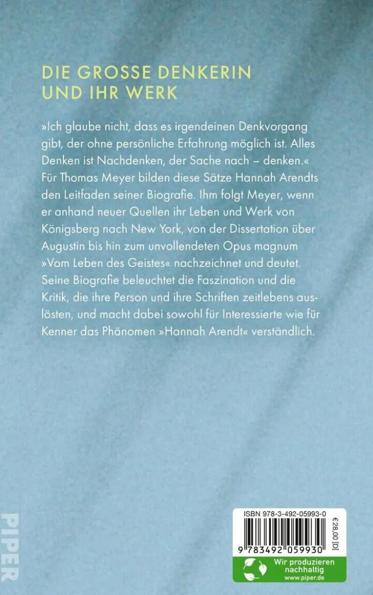 »Ich glaube nicht, dass es irgendeinen Denkvorgang gibt, der ohne persönliche Erfahrung möglich ist. Alles Denken ist Nachdenken, der Sache nach ¿ denken.« Für Thomas Meyer bilden diese Sätze Hannah Arendts den Leitfaden seiner Biografie. Ihm folgt Meyer, wenn er anhand neuer Quellen ihr Leben und Werk von Königsberg nach New York, von der Dissertation über Augustin bis hin zum unvollendeten Opus magnum »Vom Leben des Geistes« nachzeichnet und deutet. Seine Biografie beleuchtet die Faszination und die Kritik, die ihre Person und ihre Schriften zeitlebens auslösten, und macht dabei sowohl für Interessierte wie für Kenner das Phänomen »Hannah Arendt« verständlich.