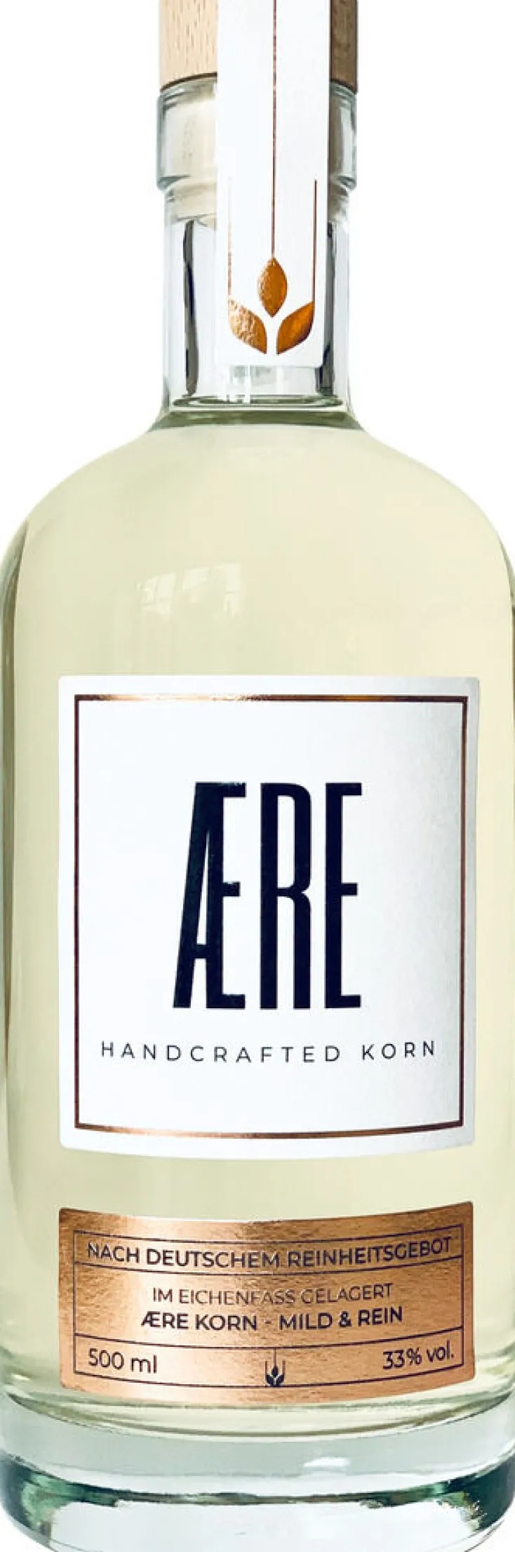 Mit 53,7 Volumenprozent im Eichenfass gereift und mit weichem niedersächsischem Quellwasser auf eine Trinkstärke von 33% verdünnt, ist der ÆRE Korn mild und perfekt ausbalanciert. Um die Reinheit des Korns zu bewahren, wurde während der Fasslagerung ein schonender Reifeprozess angestrebt. Dadurch wurden unerwünschte Geschmackselemente wie metallische und bittere Noten eliminiert, die oft mit einfachen, nicht fassgelagerten Korn-Destillaten in Verbindung gebracht werden. Hier gibt es kein Brennen im Hals, sondern einen wahren Genuss für die Sinne! Der Weizen stammt aus regionalem, nachhaltigem und kontrolliertem Anbau, um Ihnen das Beste aus der Natur bieten zu können.