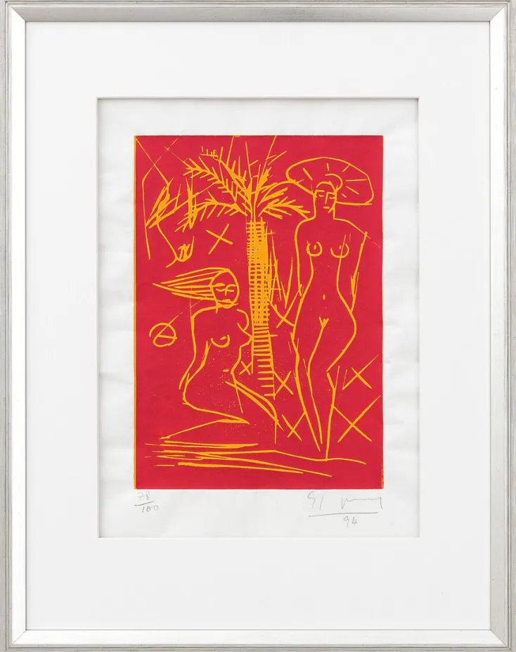 - Die typischen beim Linolschnitt entstehenden Druckstellen im feinen Japanpapier werden durch eine freischwebende Rahmung hinter Passepartout als Stilelement des Bildes noch betont