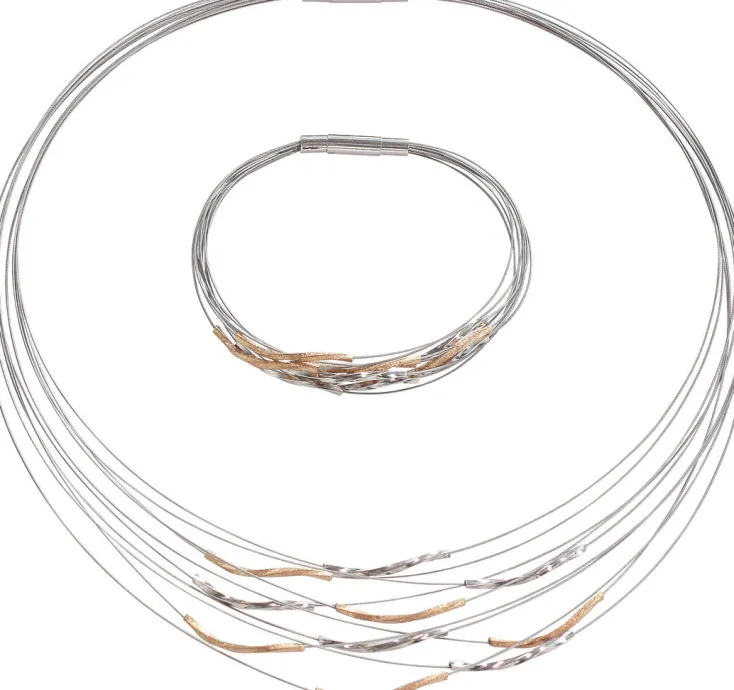 Entdecken Sie das bezaubernde Schmuckset »Waves« – eine Symphonie subtiler Eleganz. Die Mittelelemente in anmutiger Wellenform bestehen aus hochwertigem, teilvergoldetem und rhodiniertem 925er-Sterlingsilber auf Edelstahlseilen. Der Silberverschluss mit Magnetkern gewährleistet eine mühelose Handhabung. Das Set umfasst ein Collier von 43 cm Länge und ein Armband von 19 cm Länge, beide flexibel zu arrangieren. Einzelne Stücke sind ebenfalls verfügbar, sodass Sie die Möglichkeit haben, Ihre Schmuckkollektion nach Ihrem eigenen Stil zu gestalten. »Waves« verkörpert zeitlose Schönheit und individuellen Stil in einem exquisiten Ensemble. Einzeln und im Set erhältlich.
