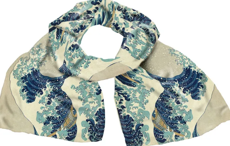 Der berühmte japanische Farbholzschnitt »Die große Welle vor Kanagawa« (1830) des Künstlers Katsushika Hokusai stand Vorbild für das Motiv des schönen Schals aus 100 % feinster Satin-Seide.