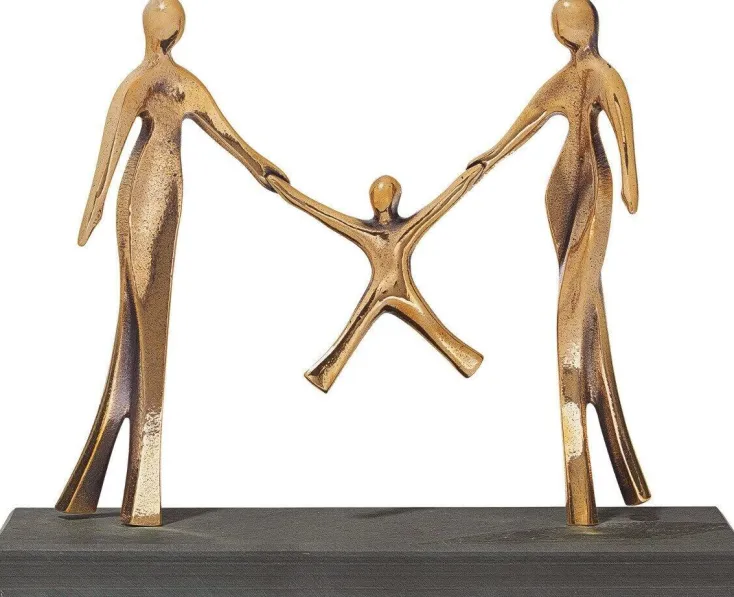 Die Familie als Dreiergespann: Vater, Mutter und Kind sind erkennbare Teile der Skulptur und doch als Familie untrennbar vereint. Die dynamische Skulptur des Malers und Objektkünstlers Bernardo Esposto besteht aus polierter Rotgussbronze und wurde dekorativ auf einem Schiefersockel platziert.