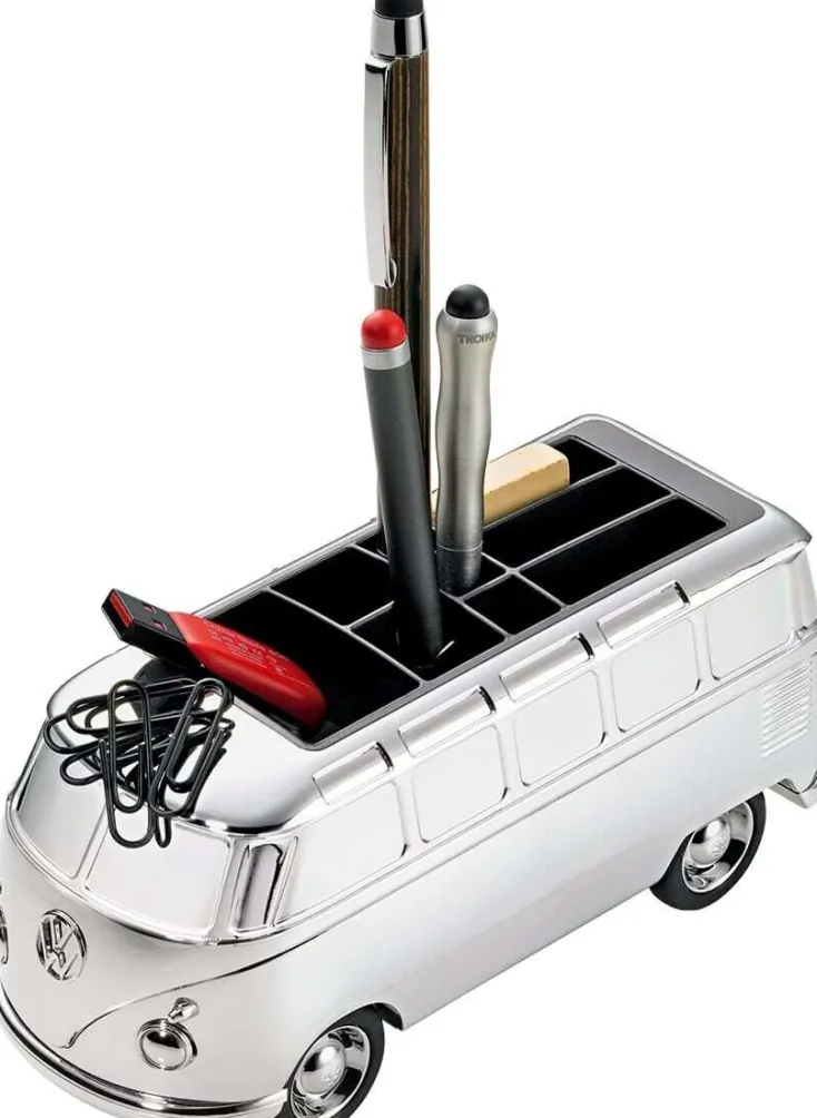 Glänzend verchromt, mit Rückziehmotor, mehreren Stifteköchern und einem Magneten für Büroklammern.