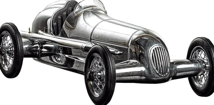 Der legendäre Rennwagen der 1930er Jahre findet seine kunstvolle Entsprechung in diesem edlen und hochwertigen Modell aus handpoliertem, silberfarbenem Aluminium.