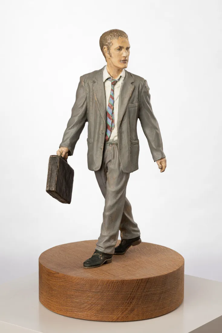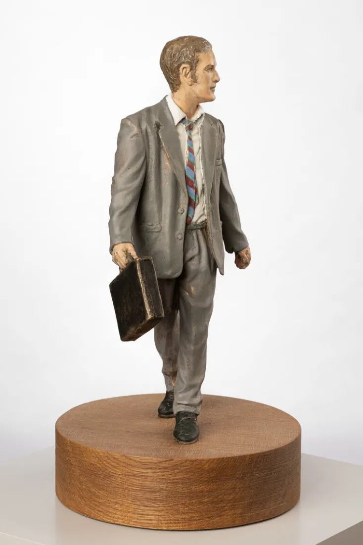 Bei einem Gang durch die Großstadt sind sie allgegenwärtig: Geschäftsleute, stets fokussiert, immer auf dem Sprung zum nächsten Meeting. Auch Christoph Pöggelers »Geschäftsmann« schreitet schwungvoll voran, doch wendet er seinen Blick zur Seite. Denn wer sich genauer umschaut, entdeckt vielleicht, dass es noch Wichtigeres gibt als den nächsten Termin.