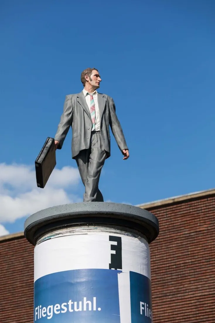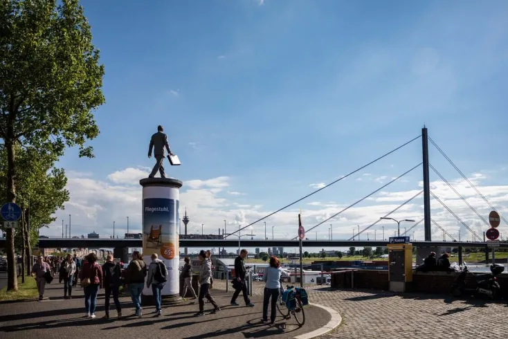 Die Skulpturen des mit dem Rheinischen Kunstpreis ausgezeichneten Künstlers Christoph Pöggeler kennt in Düsseldorf jedes Kind. An bislang 10 prominenten Standorten in der Stadt ragen die „Säulenheiligen“ lebensgroß auf Litfaßsäulen empor. In der Antike waren die Säulenheiligen Asketen, die auf Tempelsäulen lebten, um den Göttern näher zu sein. Bei Pöggeler sind es Menschen wie du und ich, die er auf das Podest hebt – in Form und Farbe so realistisch gestaltet, dass man sie für lebendig halten könnte.