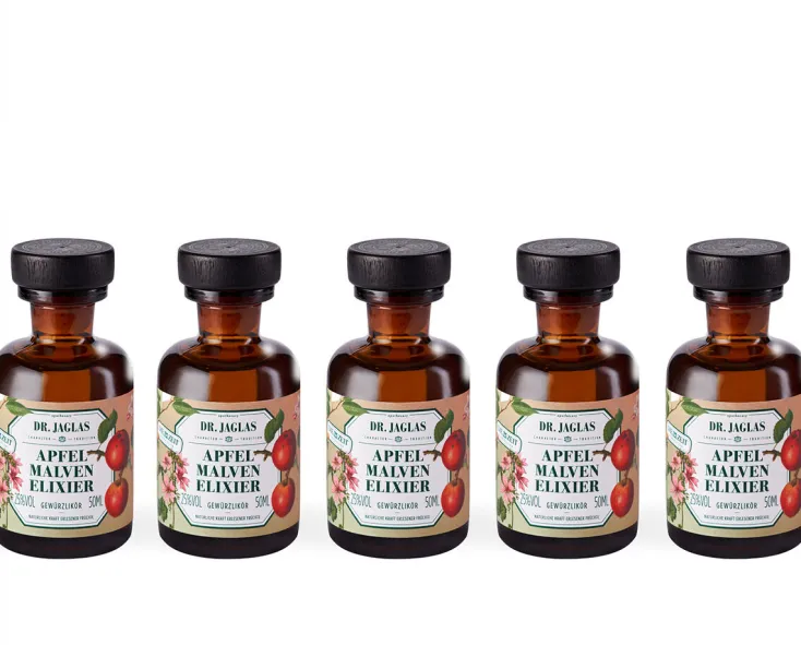 Nach schonender Reifung verbinden sich beim »Apfel-Malven-Elixier« erlesene Äpfel, Malven, Süßholz, Kardamom, Nelken, Koriander, Zimt und Sternanis zu dem lieblichen Gewürzlikör, der sowohl klassisch pur (mit Eiswürfeln und Apfelscheiben) sowie als Spritz (mit Prosecco), im Longdrink (mit Tonic) oder über dem Sorbet genossen werden kann.