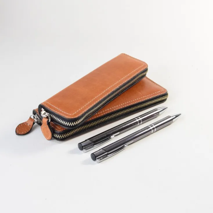 Das edle Stiftetui aus Leder wird in Handarbeit in Deutschland gefertigt und bietet Platz für zwei Stifte. Das Federmäppchen erscheint im klassischen Design und lässt sich schnell und einfach durch einen Reißverschluss verschließen. Ob Zuhause auf dem Schreibtisch oder auf Reisen – alle Stifte sind jederzeit gut aufbewahrt. Erhältlich in 2 Farben.