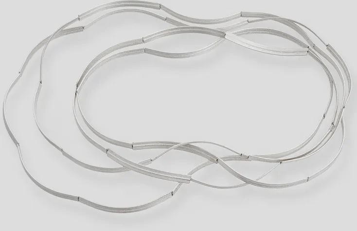 Die filigrane Kette »Bogen« von Designerin Franziska Rappold, aus der Kollektion »Geprägt«, ist aus hochwertigem Feinsilber in ihrem Atelier in Freiburg gefertigt worden. Die Schmückstücke von sind so gestaltet, dass sie variabel und unkompliziert tragbar sind. Die Gestaltungslinien der Schmuckkollektion orientieren sich an einfachen Grundformen, die sich durch eine Aneinanderreihung zu interessanten, schlichten und eleganten Schmuckstücken fügen.