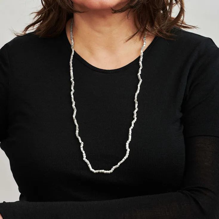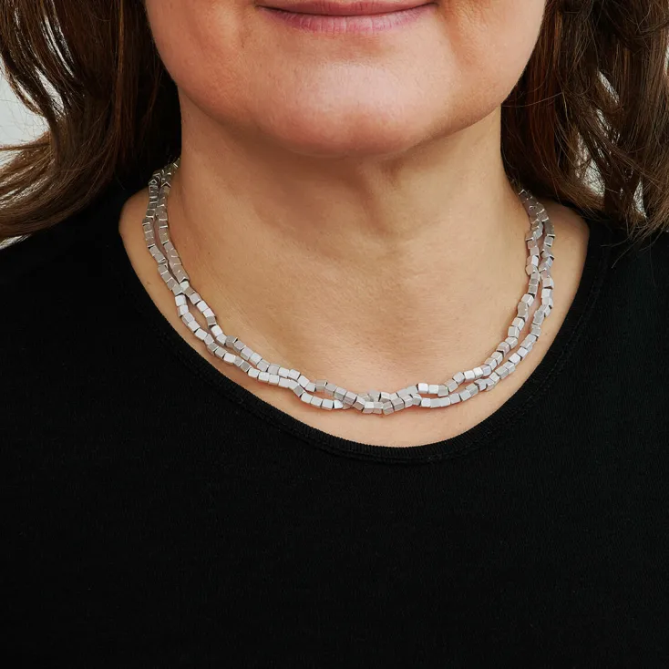 Die Schmuckkollektionen von Designerin Franziska Rappold orientieren sich an einfachen Grundformen, die sich durch eine Aneinanderreihung zu interessanten und eleganten Schmuckstücken fügen. Die Kette »Würfel« ist aus der Kollektion »Abschnitt« und aus hochwertigem Feinsilber in ihrem Atelier in Freiburg gefertigt worden. Das schlichte Schmuckstück ist vielseitig und variabel als Kette oder als wickelbares Armband tragbar.