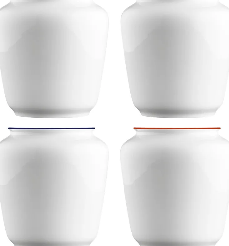 Klare Silhouetten und sachliche Funktionalität weisen jedes einzelne Stück als ein Meisterwerk bauhäuslerischer Formensprache aus. Inspiriert von der Farbenlehre Johannes Ittens zieren dezente farbige Linien die Konturen des reinweißen Manufakturporzellans und verleihen ihm einen exklusiven Charakter mit Sammlerwert.
