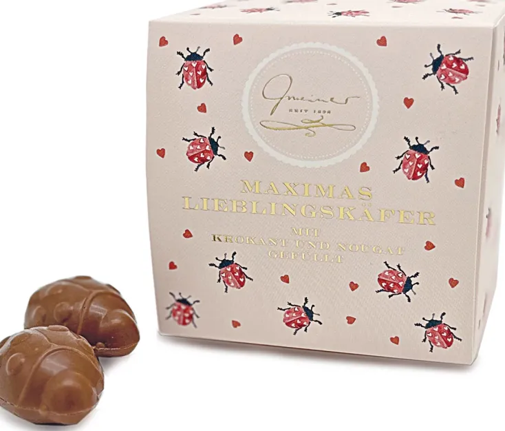 Entdecken Sie die Lieblingsschokolade der Tochter des Hauses Maxima – die süßen Marienkäfer. Diese zauberhaften Schokoladenkreationen werden aus feinster Gmeiner-Vollmilchschokolade (40 % Kakaoanteil) hergestellt und mit viel Nougatcrisp verfeinert.
