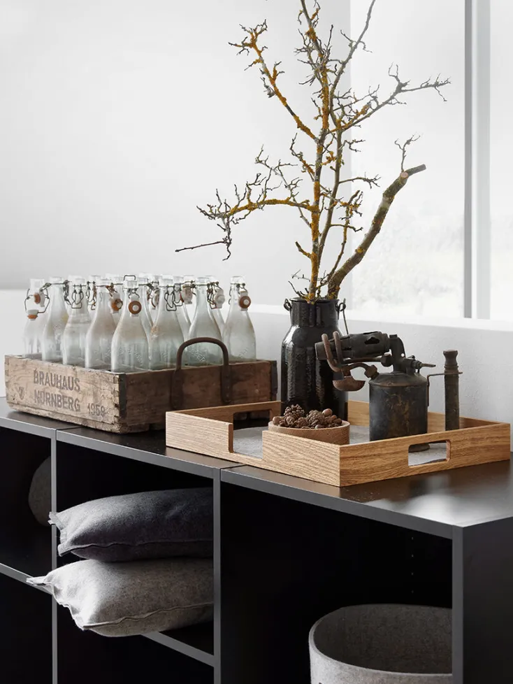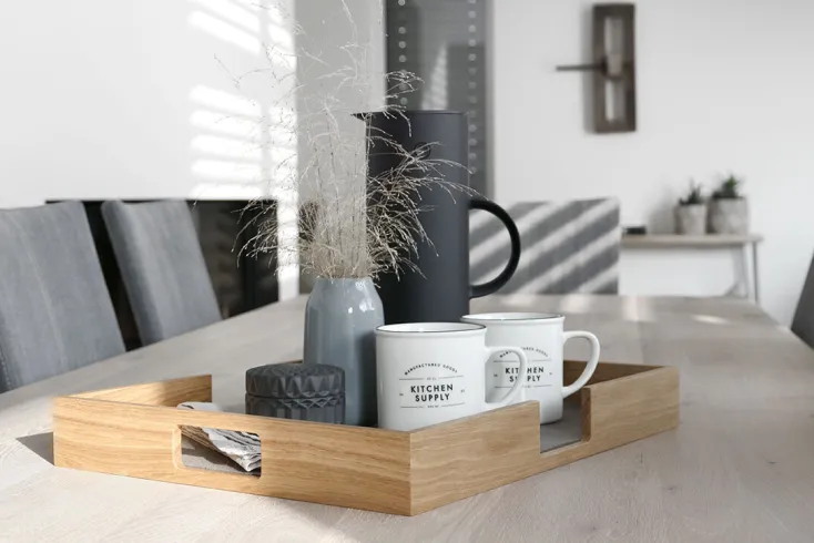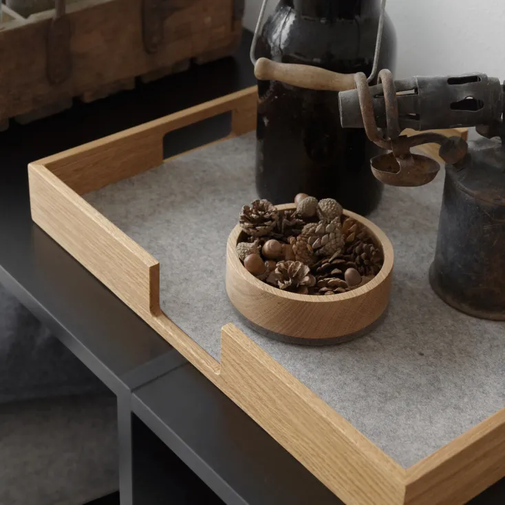 Als luftdurchlässiges, abriebfestes sowie licht- und formbeständiges Material, integriert sich Wollfilz als Einlage auf dem Holztablett mit Leichtigkeit. Seine natürlichen Wollfette verhindern ein schnelles Eindringen von Schmutz, das geölte Eichenholz des Tabletts sorgt für eine gute Haptik und ist robust – Ideal als Begleiter auf dem Beistelltisch oder als Dekorationselement im ganzen Haus.