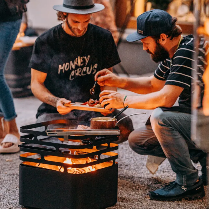 Aus dem Feuerkorb »CUBE« der Feuerkorb wird dank der massiven, emaillierten Gusseisenplatte ein Plancha Grill. Die Platten sind im Raster der Ausbrüche höhen- und hitzeregulierbar. Der Feuerkorb ist dank seines Zubehörs ein echter Allrounder!