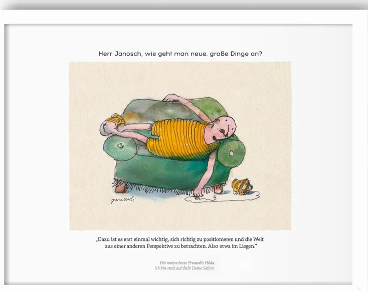 Wie erklärt man jemanden die Liebe? Wie geht man neue, große Dinge an? Wie geht eine gute Ehe? Und wie wird man eigentlich ein ausgeglichener Mensch? All diese Fragen werden vom Janosch in hochwertigen Kunstdrucken beantwortet. Auf Wunsch mit ganz persönlicher zweizeiliger Widmung.