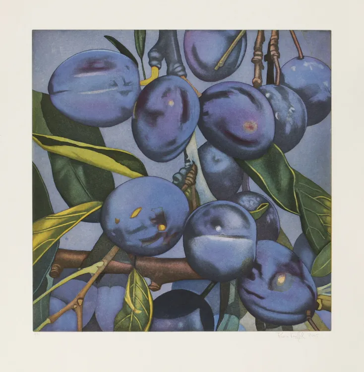 Karin Kneffel gehört zu den bedeutendsten zeitgenössischen Künstlerinnen Deutschlands, deren Werk eine außergewöhnliche Präzision und emotionale Tiefe auszeichnet. Die Pflaume ist in der Kunstgeschichte ein oft gewähltes Symbol – sie steht nicht nur für das Alltägliche, sondern auch für das Vergängliche und das Sinnliche. Karin Kneffel geht jedoch noch einen Schritt weiter und verleiht der Frucht in ihren Radierungen eine nahezu magische Präsenz. In ihren Arbeiten wird die Pflaume nicht bloß als Frucht dargestellt, sondern als ein Objekt von nahezu metaphysischer Bedeutung. Ihre Darstellungen sind von einer außergewöhnlichen Detailtreue und einer faszinierenden Tiefenwirkung geprägt. Limitiert auf 90 Kunstwerke.