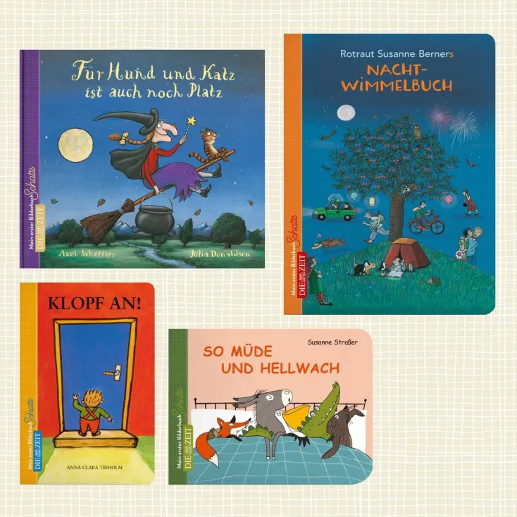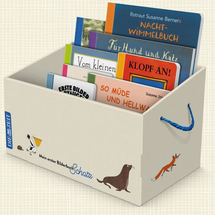 Die ZEIT-Edition »Mein erster Bilderbuchschatz« bereichert Kinder von Geburt an und wird sie lange begleiten. Bekannte Klassiker, die in keinem Bilderbuchregal fehlen dürfen, sind ebenso enthalten wie neu entdeckte Perlen. So lädt das interaktive Bilderbuch »Klopf an« zum festen Anklopfen auf den stabilen Pappseiten ein: Was wartet wohl hinter der Tür? Die Schöpfer des weltberühmten Grüffelo entführen in »Für Hund und Katz ist auch noch Platz« in die Welt von Hexen und Drachen und im »Nacht-Wimmelbuch« von Rotraut Susanne Berner dürfen die wuseligen Bilder nach unzähligen Details durchsucht werden.