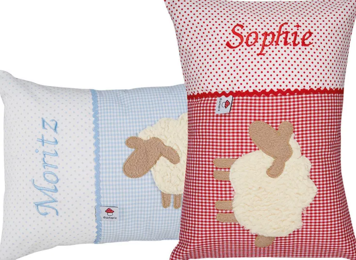 Die individualisierbaren Kissen von Glückspilz werden aus 100 % Baumwolle in Deutschland hergestellt. Die individuelle Bestickung des Wunschnamens wird per Hand aufgetragen und sorgt mit der jeweils passenden Zackenlitze dafür, dass jedes Kissen zum Unikat wird. Das aufwendig in Handarbeit hergestellte Namenskissen »Schaf« ist für Jungen und Mädchen gleichermaßen geeignet und ein wunderschönes Geschenk zur Geburt, Taufe oder zum Geburtstag.