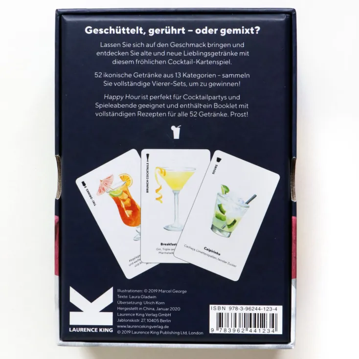 »Happy Hour« ist nicht nur ein klassisches Kartenspiel, sondern enthält auch ein informatives Booklet mit kurzen Geschichten und Rezepten zu jedem der 52 Getränke. So können Sie nicht nur spielen, sondern auch mehr über Ihre Lieblingscocktails erfahren und sie selbst mixen. Ein ideales Gastgeschenk und eine gelungene Bereicherung für jede Feier. Auf Ihr Wohl!