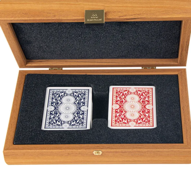 Die Kassette ist aus Holz gefertigt und hat ein Velours-Innenfutter, was ihr eine einzigartige Note von Eleganz verleiht. Innerhalb der Kassette befinden sich zwei Decks kunststoffbeschichteter Spielkarten in Marineblau und Rot. Schlicht und dennoch elegant; unsere Kollektion von Spielkarten ist alles, was Sie für einen unterhaltsamen Abend mit Freunden benötigen.