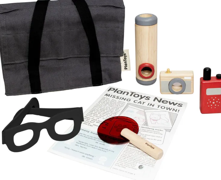 Das umfangreiche Detektivset von Plan Toys beinhaltet alle Utensilien, die kleine Kriminalistinnen und clevere Detektive für die erfolgreiche Auflösung kniffliger Fälle benötigen. In der praktischen Tasche finden sich Kamera, Funkgerät, eine rote Linse um Fingerabdrücke in der Zeitung zu finden und ein Periskop um auch aus dem Versteck alles genau im Blick behalten zu können.