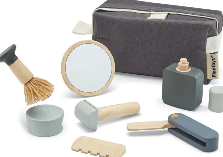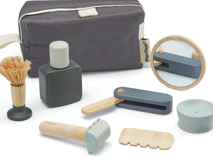 Peppe die Morgenroutine mit dem PlanToys Rasier Set auf! Mit einem Kulturbeutel, einem Kamm, einem Rasiermesser, einem Trimmer, einem Schaumtiegel, einem Rasierpinsel, einem Spiegel und einer Aftershave-Flasche ist dieses Spielzeug die perfekte Ergänzung für die Rollenspielsammlung eines jeden Kindes.