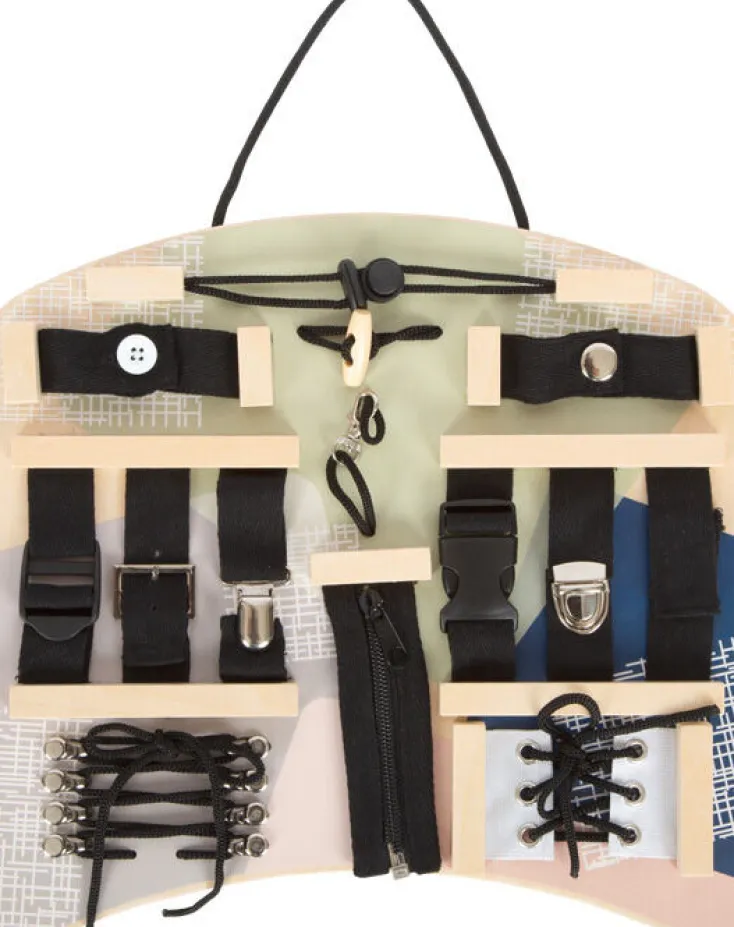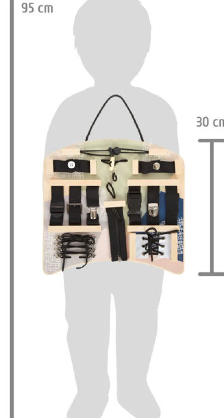 Es umfasst eine Vielzahl an Verschlüssen – von Knebelknopf mit Schlinge, Gürtelschnalle, Klettverschluss und Hosenträgerklemme bis hin zu Reiß- und Klickverschluss – die Kinder spielerisch erlernen können. Zusätzlich sind Schnürsenkel zum Fädeln und Schleifebinden enthalten, um die Hand-Augen-Koordination zu trainieren. Ein praktischer Griff erleichtert das Tragen und Aufhängen.