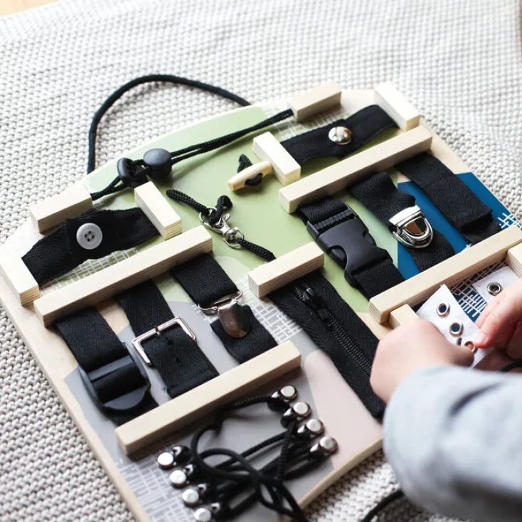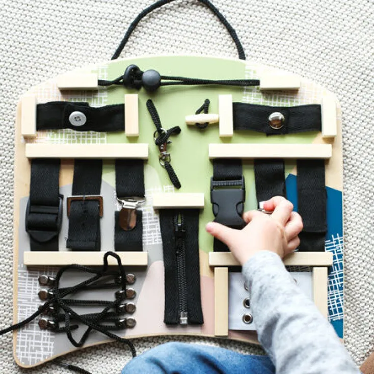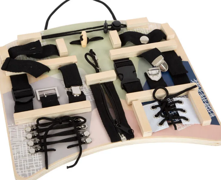 Das Small Foot Motorikbrett bietet 14 verschiedene Verschlussmöglichkeiten aus Holz, um die feinmotorischen Fähigkeiten von Kleinkindern ab 3 Jahren spielerisch zu fördern.