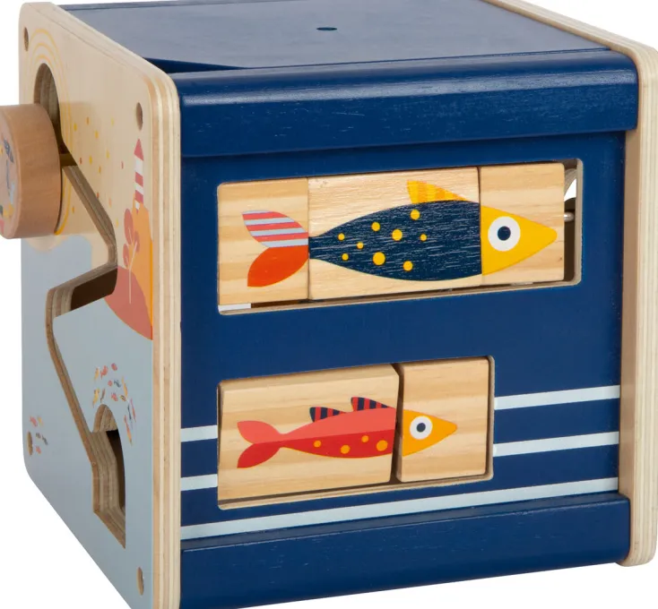 Dieser maritime Motorikwürfel »Großer Ozean« aus stabilem Holz bietet mit seinen verschiedenen Spielflächen und ansprechendem Design vielseitige Spielmöglichkeiten für Kinder. Der Motorikwürfel hat zwei Motorikschleifen, ein Formen-Steckspiel, ein Schiebelabyrinth und einem Drehklappen-Spiel auf fünf verschiedenen Spielflächen. In modernen Farben gestaltet und mit hohem Naturholzanteil versehen, fördert der Würfel die Wahrnehmung, Geschicklichkeit und Fantasie der Kinder. Durch abgerundete Kanten und die Integration von Unterwasser-Motiven bietet er nicht nur stundenlangen Spielspaß, sondern auch eine angenehme Haptik. Ein ideales Spielzeug für kleine Entdecker.