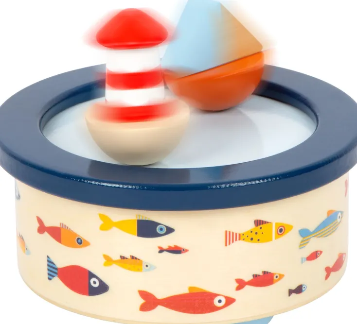 Die maritime Spieluhr »Großer Ozean« aus Holz verzaubert mit dem Schlaflied »Weißt Du, wieviel Sternlein stehen« und begleitet Kinder behutsam ins Land der Träume. Ein kleines Schauspiel entfaltet sich, wenn der Leuchtturm und das Segelboot im Takt der Melodie sanft im Kreis tanzen. Mit kinderleichter Bedienbarkeit ist diese Spieluhr besonders auf die kleinen Hände zugeschnitten. Die abnehmbaren Holzfiguren ermöglichen es sogar den Kleinsten, die Spieluhr eigenständig zu nutzen. Das zentrale Designelement der Unterwasserwelt begeistert mit liebevollen Details und kinderfreundlichem Charme. Neben ihrer Funktion als Einschlafhilfe wird die Spieluhr zu einem dekorativen Blickfang im Kinderzimmer. Abgerundete Kanten verleihen nicht nur eine angenehme Haptik, sondern unterstreichen auch die hochwertige Verarbeitung.