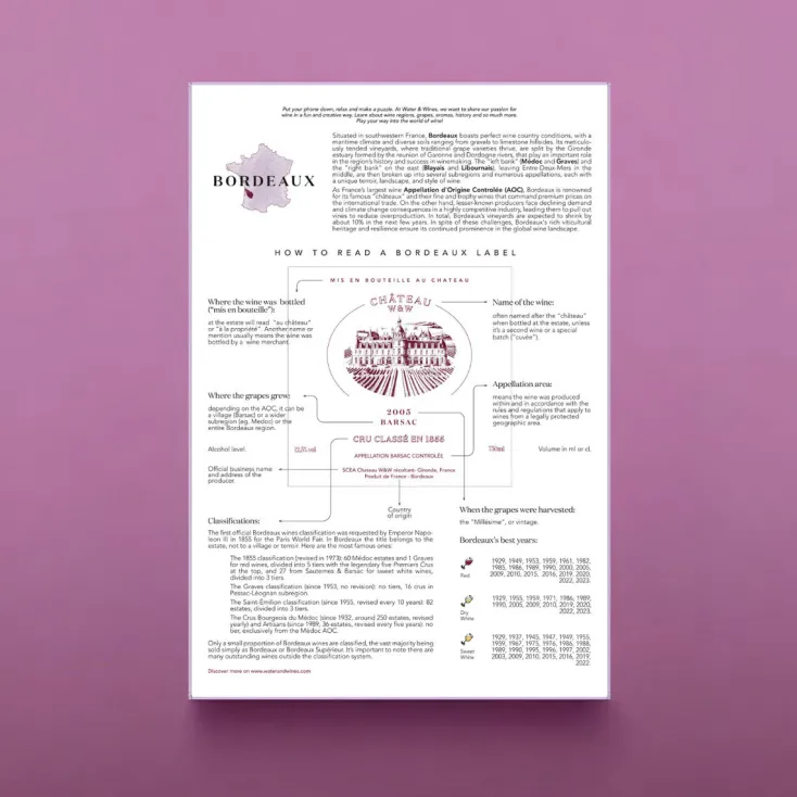 Die von erfahrenen Sommeliers gestaltete Puzzlebox bietet Traubenprofile einiger der bekanntesten spanischen Rebsorten mit detaillierten Angaben zu ihren Aromen, Haupteigenschaften und Tipps für die Kombination mit Speisen. Tauchen Sie ein in die farbenfrohe Welt der spanischen Weine, während Sie dieses bezaubernde Puzzle zusammensetzen, von den knackigen Weißweinen Galiciens bis zu den vulkanischen Rotweinen der Kanarischen Inseln.