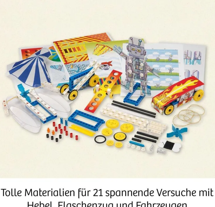 Zu Land, zu Wasser und in der Luft – mit diesem Experimentierkasten kommen Kinder von 5 bis 8 Jahren technischen Alltagsphänomenen auf die Spur. Wissenschaft in Fahrt! In 21 verblüffenden Versuchen finden sie ganz spielerisch heraus, wie Hebel und Flaschenzüge funktionieren oder was ein Fahrzeug antreibt Klicken, stecken, falten, kleben und ausprobieren – hier ist Lernen mit allen Sinnen angesagt. Das fördert nicht nur Fingerfertigkeit und planvolles Vorgehen, sondern macht auch großen Spaß! Die kindgerechte Anleitung zeigt alle Arbeitsschritte in übersichtlichen Bildern und unterstützt selbständiges Forschen auch ohne Lesekenntnisse – genau das Richtige für Vorschulkinder. Ein vielseitiger Experimentierkasten von KOSMOS, der Mädchen und Jungen spielerisch erste technische Zusammenhänge vermittelt Zu Land, zu Wasser und in der Luft – hier wird Technik spielerisch erforscht. Ein kleines Auto flitzt durchs Zimmer und wird zum Schaufelradboot umgebaut. Ein Papierflieger gleitet elegant durch die Luft und der Fallschirm segelt zu Boden. Aber warum ist er so langsam? Das erklärt die Anleitung! Mit den 21 spannenden, aber einfachen Versuchen aus diesem KOSMOS Experimentierkasten entdecken Kinder, was hinter den Phänomenen aus ihrem Alltag steckt. Um das Forschen ohne Lesekenntnisse zu erleichtern, werden alle Handgriffe anschaulich in Bildern erklärt. So sind Erfolgserlebnisse garantiert! Das vielseitige Material aus Systembauteilen und bunten Ausschneidebögen fördert ganz nebenbei die Feinmotorik und Konzentration. Ein abwechslungsreicher Start in die Welt der Technik für Kinder von 5 bis 8 Jahren.