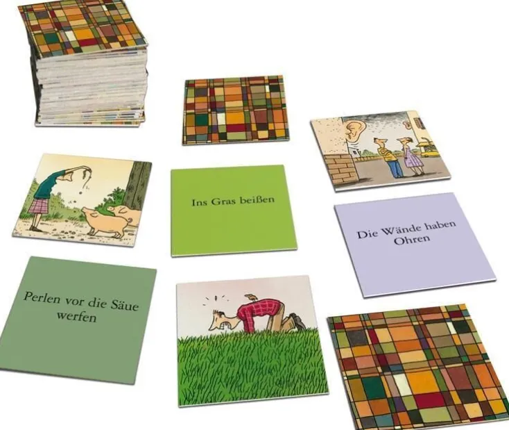 Philip Waechters geniale und witzige Verbildlichung der schönsten deutschen Redensarten als Memospiel: Hier muss man die zu den Zeichnungen gehörige Redensart überlegen und sie dann als Textmemokarte finden. Mit schönem Büchlein, in dem alle Redensarten ausführlich hergeleitet werden. Ein kultiviertes und anregendes Memospiel für die ganze Familie.