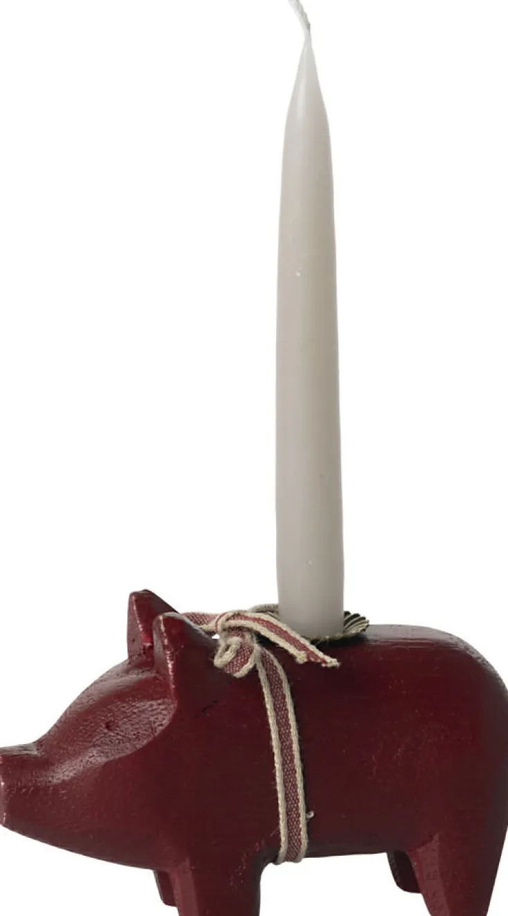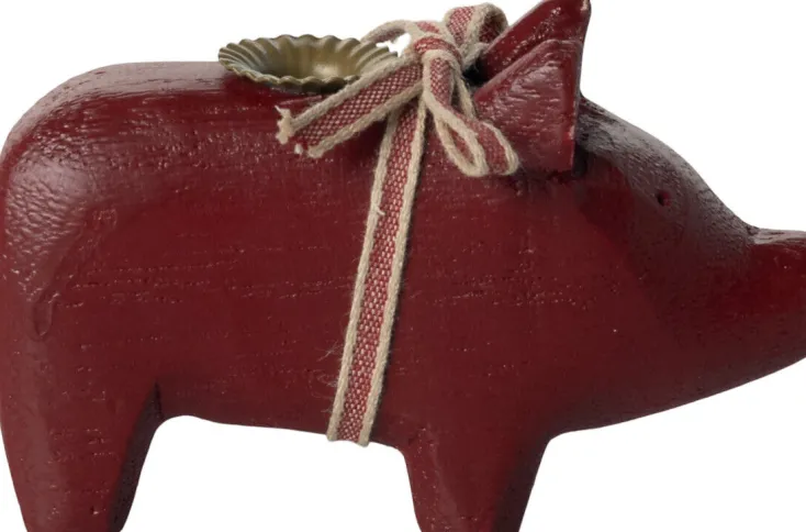 Dieses charmante, handbemalte Holzschwein von Maileg bringt nostalgische Weihnachtsstimmung in jedes Zuhause. Der kleine Kerzenhalter im klassischen skandinavischen Design vereint Tradition mit moderner Raffinesse. Die leuchtend rote Farbe und die zarten Bänder verleihen eine warme Atmosphäre, während die kleine Messingschale auf der Rückseite Platz für eine Kerze (Ø1,2 cm) bietet.