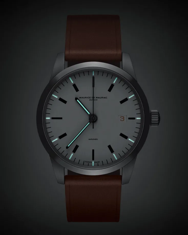 Exklusiv für DIE ZEIT erscheint die »L1« (39mm) der Zürcher Uhrenmanufaktur MAURICE DE MAURIAC mit einer Datumsanzeige in einem charmanten Cognac-Ton und passenden, handgefertigten Armband aus feinstem Barenia Leder und in einer limitierten Auflage von nur 50 Stück.