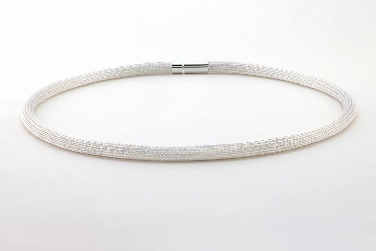 Dieses Collier ist ein sehr edles „Strumpfgeflecht“ ohne Naht aus feinsten Silberdrähten. Der einzigartige Tragekomfort entsteht durch die glatte, anschmiegsame Oberfläche des in sich fließenden beweglichen Geflechts. Die gleichmäßige Rundung bleibt auch dann erhalten, wenn man sie mit einem Anhänger trägt, da sie im Innern verstärkt ist.