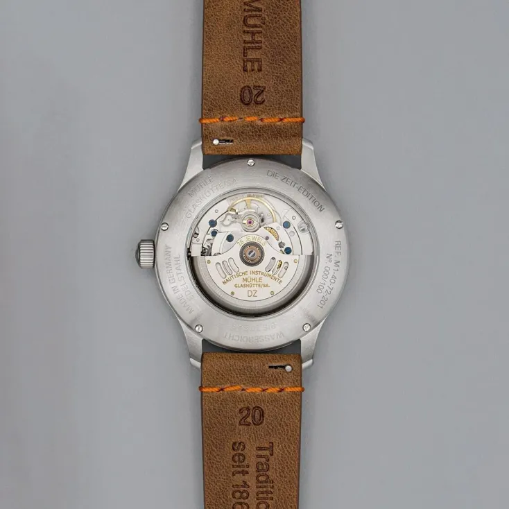 Darüber hinaus wird das Uhrwerk der ZEIT-Sonderedition »Panova Blau« mit dem hauseigenen Mühle-Rotor ausgestattet. Dieser sorgt nicht nur für den effizienten Aufzug des Automatik-Uhrwerks, er kann auch mit den Initialen des zukünftigen Trägers der Panova Blau „Edition ZEIT“ graviert werden. Ein Saphirglas-Sichtboden ermöglicht dabei den freien Blick in das ebenso individuelle wie fein veredelte Herz der auf 100 Exemplare limitierten Uhr.