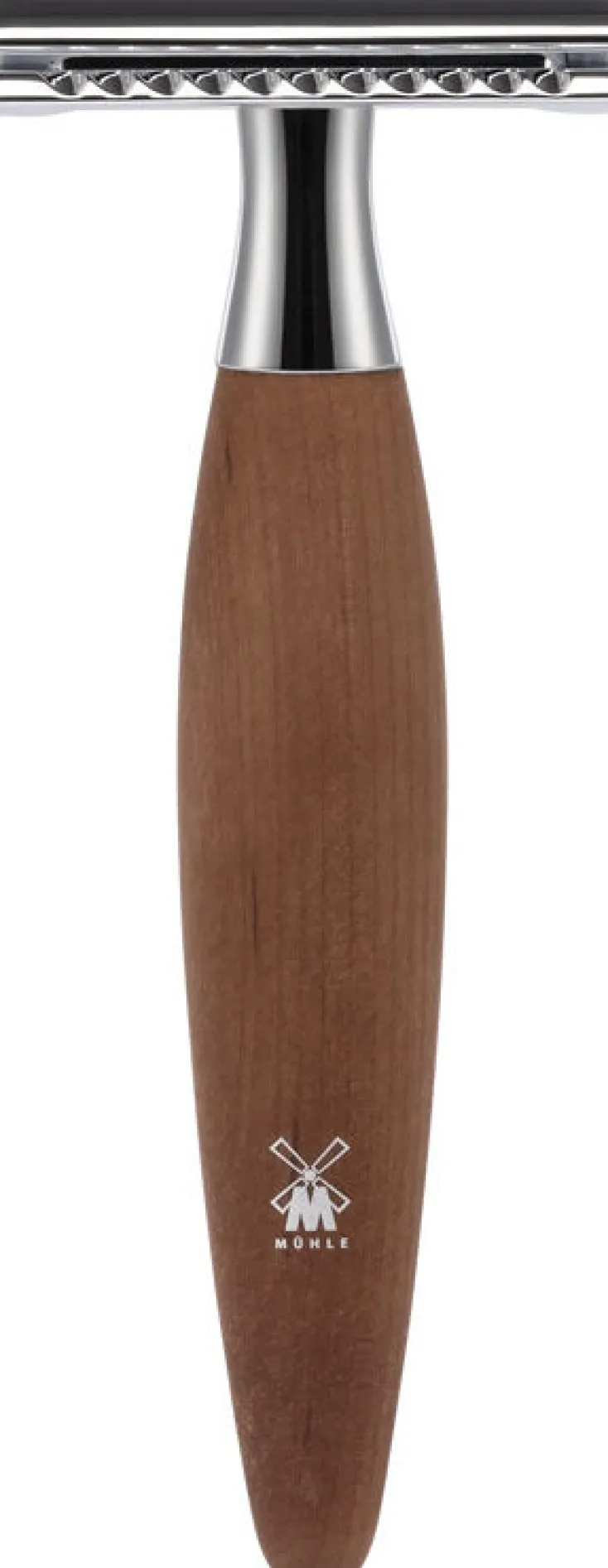 - mit klassischen Rasierklingen, Griff aus Birnbaumholz, verchromte Metallakzente