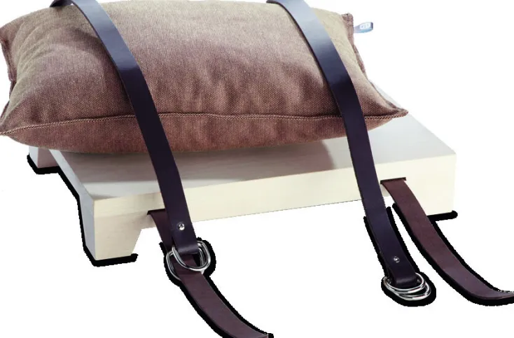 Auch jedes nju-Kissen ist ein handgefertigtes Einzelstück. Der Panama-Bezug umfasst eine Füllung aus weichem Polyester. Und selbst die Lederbänder werden für dieses besondere Aufbewahrungssystem speziell konfiguriert und händisch mit Schnallen und Nieten versehen.
