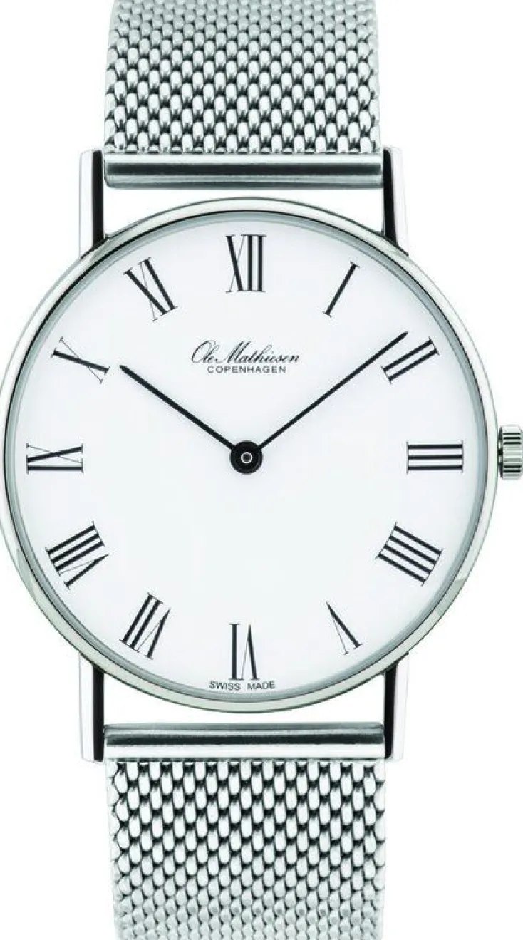 Seit 1845 und über drei Generationen hinweg hat sich Ole Mathiesen ein außergewöhnliches Maß an Kontinuität und eine große Bewunderung für traditionelles Uhrenhandwerk, neue Technologien und ästhetisches Design bewahrt. Ole Mathiesen lernte sein Handwerk unter anderem bei dem schweizerischen Hersteller Jaeger-LeCoultre und entwarf 1962 eine Kollektion klassischer Uhren von zeitloser Eleganz. Da eine Uhr jedoch mehr sein muss, als nur ein schöner Besitz, wird auch die erstklassige Qualität der Uhren bis heute von Ole Mathiesen persönlich überwacht. Das Modell OM1 kombiniert ein weißes Zifferblatt mit römischen Ziffern in Schwarz, ergänzt durch ein kratzfestes gewölbtes Saphirglas. Komplettiert wird der elegante Zeitmesser durch das vielseitig und bequem zu tragende schwarze Lederarmband oder das elegante Milanaisearmband aus Edelstahl.
