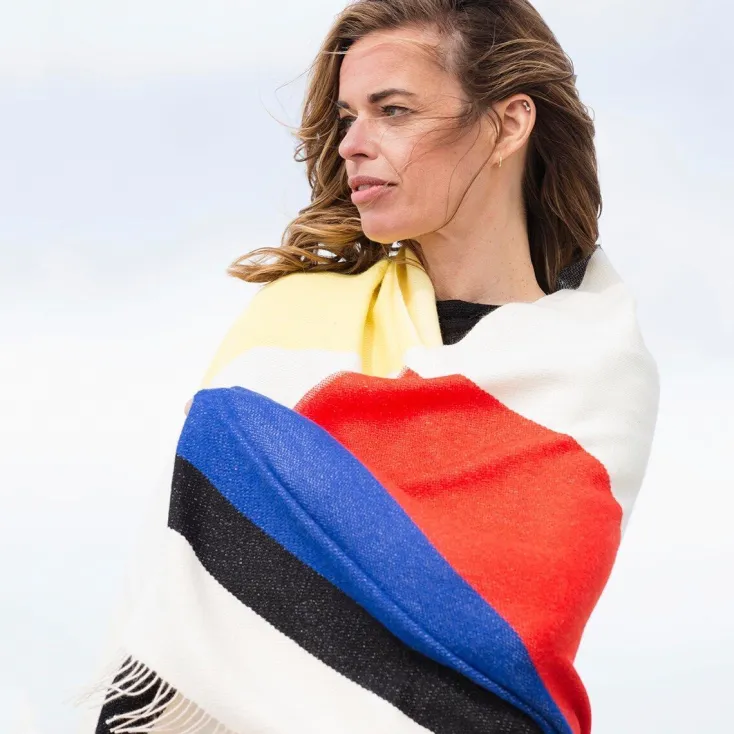 Dieser außergewöhnliche Schal, inspiriert von den Bauhaus-Farben und exklusiv entworfen für die ZEIT, vereint moderne Eleganz mit leuchtenden Farben und zeichnet sich gleichzeitig durch hervorragende Qualität aus. In Peru aus 100 % Baby-Alpaka-Wolle gewebt, ist der Schal ein wahrer Hautschmeichler. Die wertvolle Naturfaser hat hervorragende Thermoeigenschaften und lässt sich sowohl im Winter als auch im Sommer angenehm tragen. Außerdem überzeugt der Schal mit seiner Vielseitigkeit: Er eignet sich als Cape, Plaid, Stola oder Poncho. Seine Leichtigkeit und einfache Kombinierbarkeit machen ihn zu einem absoluten Lieblingsstück. Erhältlich in den Farbvarianten Weiß und Schwarz.
