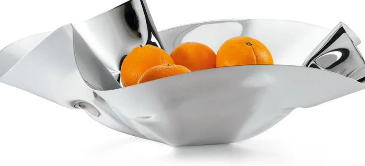 Mango, Kiwi, Lychee und Pitaya – in der Schale »MARGARETHE« treffen sich die Früchte der Welt. Bereits ihr silbern glänzendes Antlitz verspricht eine zum Anbeißen leckere Schönheit, ihr Inhalt bringt erst die süßen Gaumenfreuden dazu. Die sanft geschwungenen Falten sind von Hand in Form gebracht – somit ist jede einzelne Schale ein exklusives Unikat für sich.
