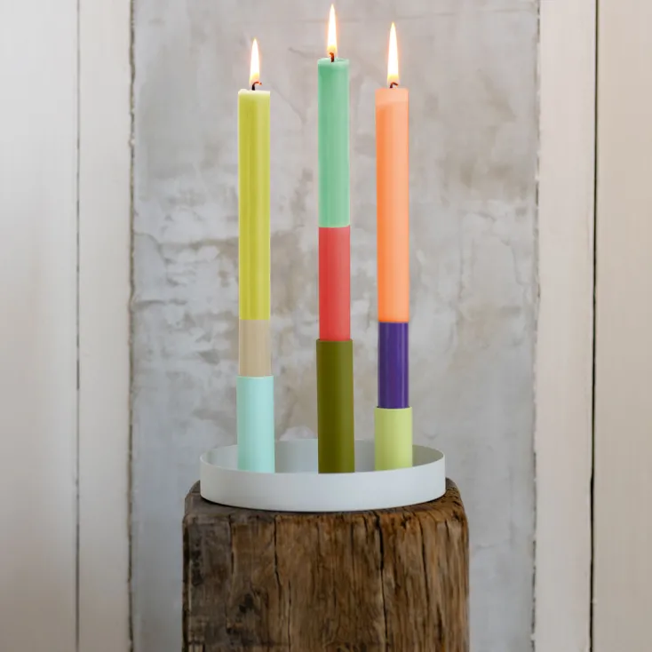 Für diese Kerzen muss man einfach brennen: Die farbenfrohen Stabkerzen im Color-Blocking-Design werden in einer Fair-Trade-Produktionsstätte Wachsschicht auf Wachsschicht in Handarbeit gegossen.