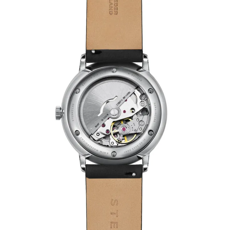Der in Hamburg gefertigte Zeitmesser erscheint im klassisch eleganten Bauhaus Design im 38mm großen Gehäuse, mit durchsichtigen Saphir-Sichtboden mit Sicht auf das Uhrwerk und ist exklusiv nur im ZEIT Shop erhältlich.