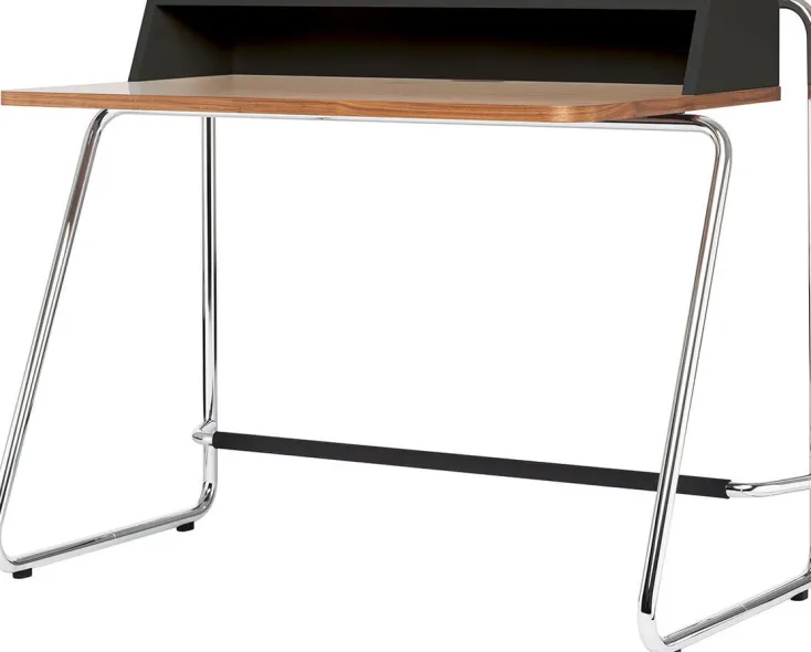 - Material: Nussbaum geölte Schreibtisch-Platte, schwarz lackierte Kanten/Aufsatz mit Gestell aus Chrom