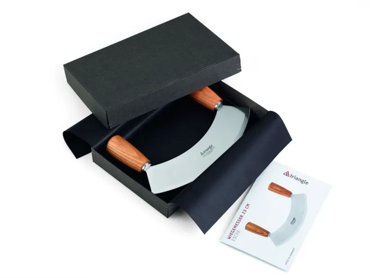 Das Wiegemesser »Soul« von triangle beeindruckt nicht nur durch sein elegantes Design mit fein gearbeiteten Griffen aus deutscher Kernesche, sondern auch durch seine außerordentlich hochwertige, gehärtete Klinge. Wiegemesser werden traditionell verwendet, um Kräuter, Nüsse, Knoblauchzehen und ähnliches schnell und einfach zu zerkleinern. Mit einer Länge von 23 cm sind größere Modelle jedoch auch ideal zum Schneiden von Pizza, Flammkuchen und Blechkuchen geeignet und machen auch auf dem Tisch eine gute Figur.