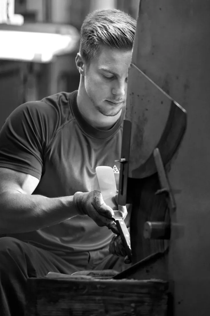 Dank der ergonomisch geformten Handgriffe des einschneidigen Wiegemessers ist eine sichere Handhabung und optimale Kraftübertragung gewährleistet, was ein ermüdungsfreies Arbeiten ermöglicht. Die gehärtete Klinge, die bei Wiegemessern selten anzutreffen ist, ist besonders scharf und behält ihre Schärfe lange bei. Jedes triangle Wiegemesser wird in Handarbeit hergestellt und durchläuft einen mehrstufigen Schärfe-Prozess, wobei der Feinabzug per Hand am Schleifband erfolgt.