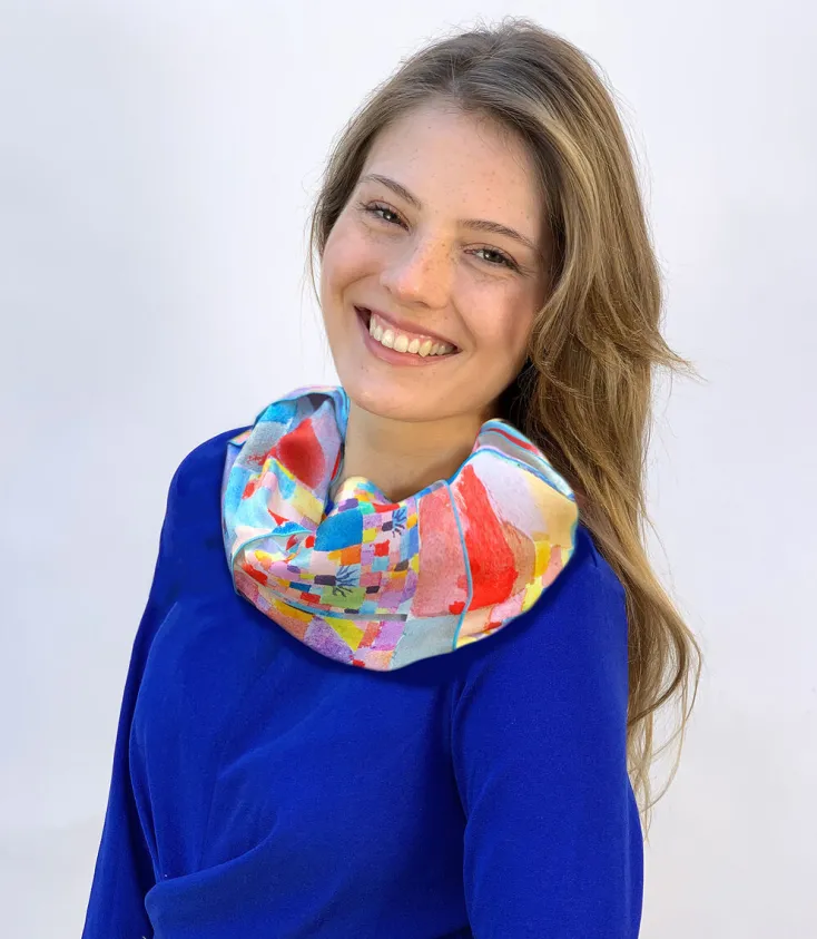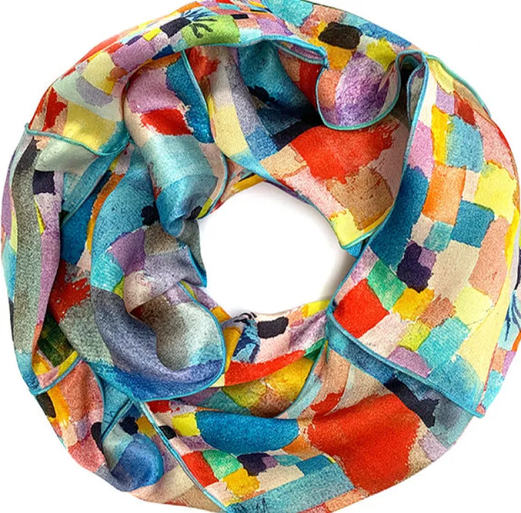 Der leichte Rundschal in frischen Pastelltönen ist aus hochwertigem Seidensatin gefertig und nach abstrakten Motiven des Aquarells „Südliche Gärten“ vom Künstler Paul Klee bedruckt. Durch das helle und einzigartige Design des Schals eignet er sich bestens als Geschenk für begeisterte Kunst- und Modefans und passt perfekt zu sonnigen Frühlings- oder Sommertagen.