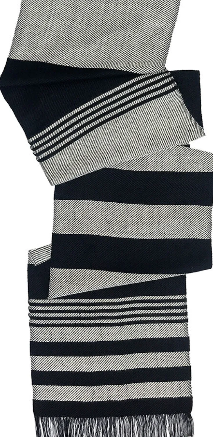 Der handgefertigte Seidenschal in schwarz und weiß ist mit seiner schlichten Eleganz ein wahres Lieblingsteil. Das Gewebe aus reiner Seide ist weich und anschmiegsam und bietet im Herbst, Winter und Frühling einen zuverlässigen Kälteschutz. Die asymmetrisch angeordneten Streifen, mit leicht sportlicher Note, und die klassische Farbkombination machen den Schal zu einem besonderen Blickfang, der sowohl zu kräftigen, als auch auch zu zarten Tönen passt. Jeder Schal wird einzeln auf einem hölzernen Webstuhl in Körperbindung handgewebt, was jedes Stück einzigartig macht.