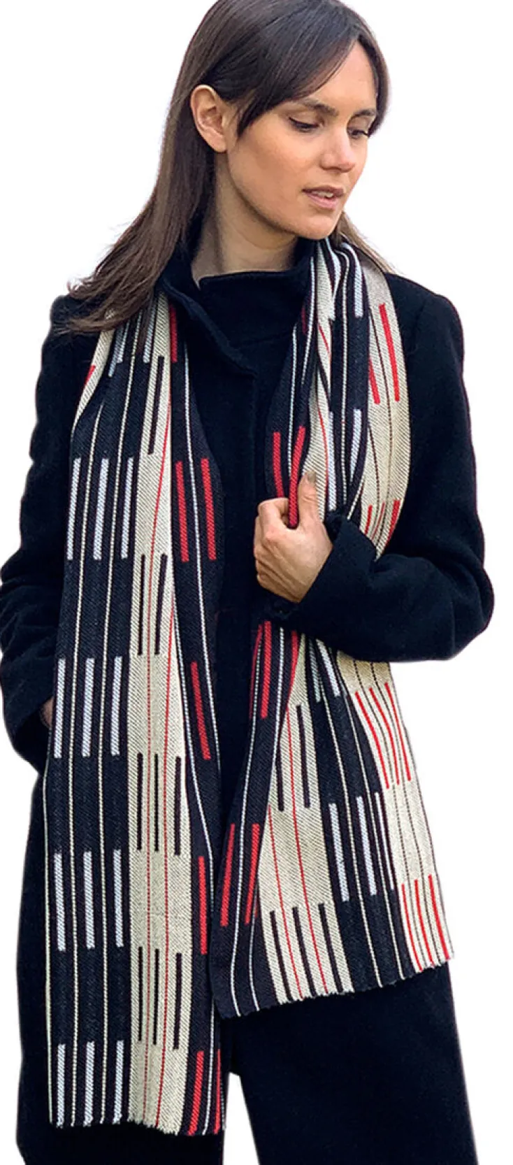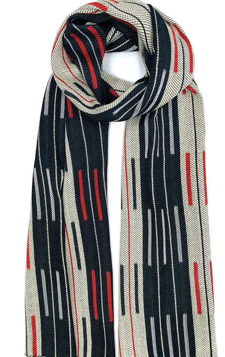 Entdecken Sie den Seidenschal in Natur und Schwarz mit roten grafischen Elementen – ein außergewöhnliches Accessoire, inspiriert von den Farben und dem Design des Bauhauses. Die schlichte Eleganz der reduzierten Musterung macht ihn zu einem vielseitigen Begleiter, der jedes Outfit bereichert und garantiert alle Blicke auf sich zieht. Dieser einzigartige Doublé-Schal wird in limitierter Auflage aufwendig am Handwebstuhl gefertigt, wodurch er seine unvergleichliche Ausstrahlung erhält. Sein Design ist eine Hommage an die beeindruckenden Webarbeiten der Textilkünstlerin und Bauhaus-Weberin Anni Albers.